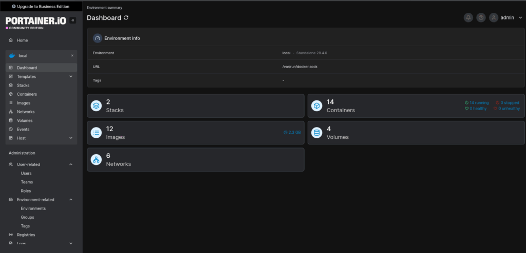 Sekarang kita melakukan instalasi portainer yang berfungsi untuk memudahkan kita untuk manage docker dengan dashboard, untuk instalasi bisa dilihat pada dokumentasi resmi https://docs.portainer.io/start/install-ce/server/docker/linux