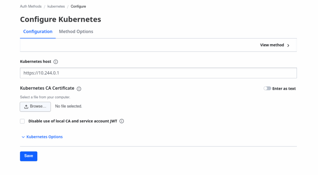 Setelah kita enable kubernetes method, kita harus isi Kubernetes Host, untuk mengetahui IP Address kubernetes host kita bisa menggunakan kubectl