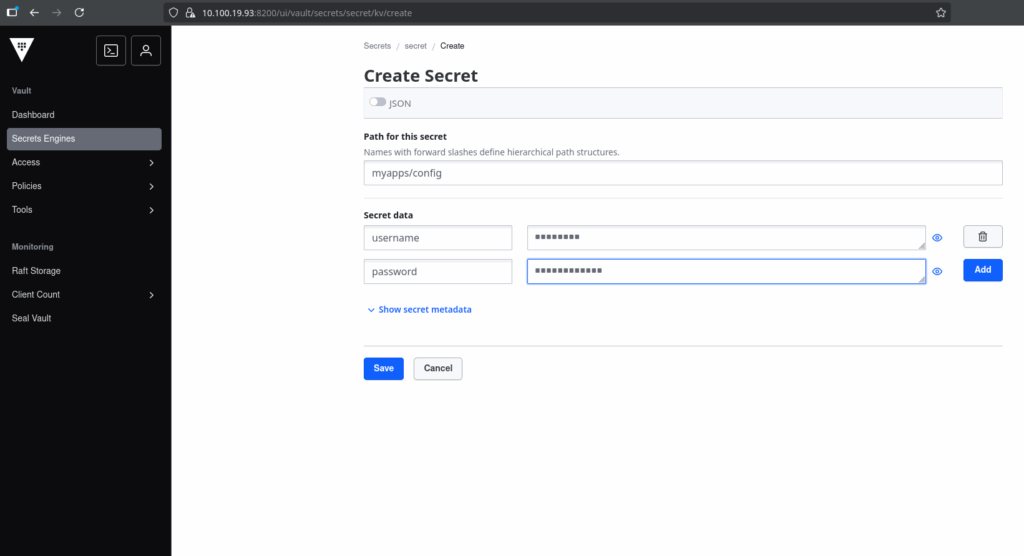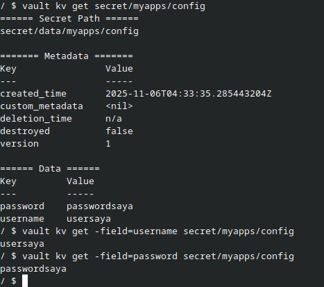 vault kv put secret/myapps/config username="usersaya" password="passwordsaya"