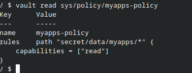 Ada 2 cara untuk konfiguarsi pada vault, bisa menggunakan CLI dan GUI. Pada tahap ini kita akan membuat secret, policy, dan kubernetes auth menggunakan CLI yang diexec dari vault-0.