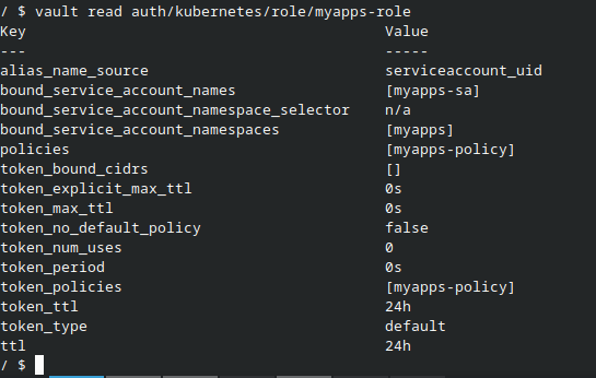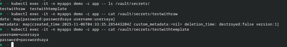 kubectl exec -it -n myapps demo -c app -- cat /vault/secrets/testwithraw