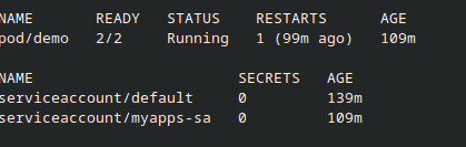 Sekarang kita apply file manifest tersebut kemudian check pods dan service-account tersebut