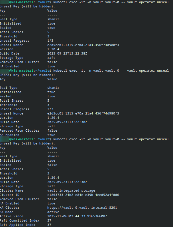 kubectl exec -it -n vault vault-0 -- vault operator unseal