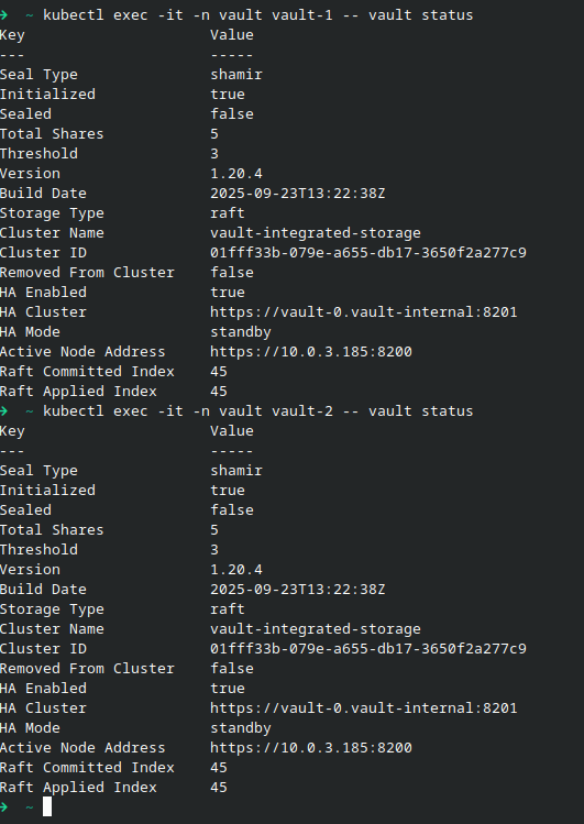Kita sudah init cluster dan unseal vault-0. Sekarang kita harus join raft-cluster dari vault-1 dan vault-2 ke raft-cluster