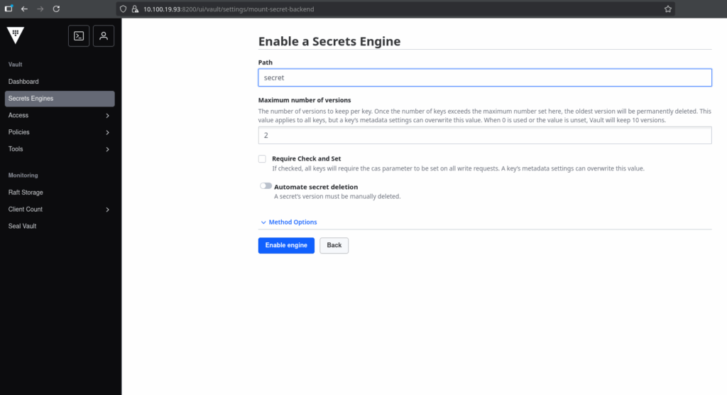 Buat engine kv-v2 dengan cara, Secret Engine -> Enable new engine -> Pilih KV -> Isi path dengan nama secret