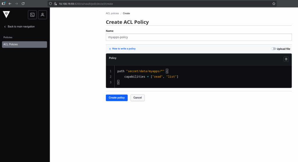 Sekarang kita akan membuat policy hanya bisa akses read ke secret tersebut, Policies -> Create ACL Policy -> kemudian kita beri nama policy myapps-policy dan acl
