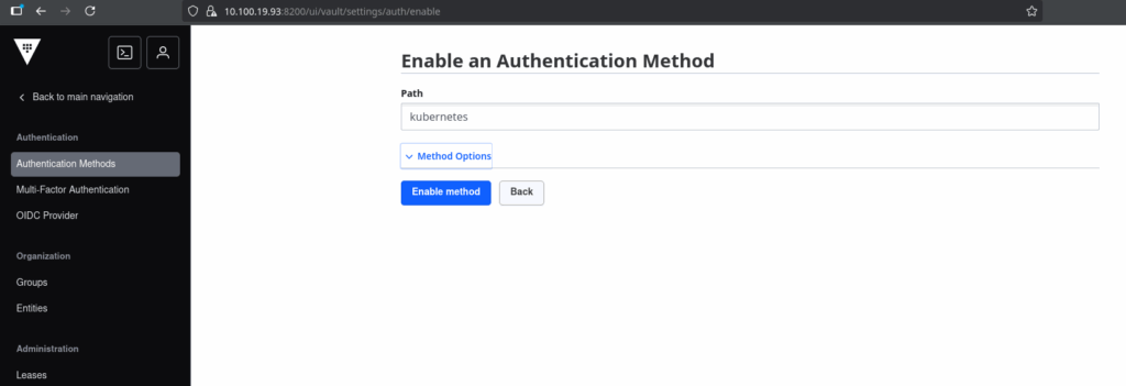 Sekarang kita akan konfiguarsi agar vault kita bisa terhubung ke kubernetes cluster, Access -> Enable new method -> Kubernetes -> Enable method (pathnya menggunakan default yaitu kubernetes)