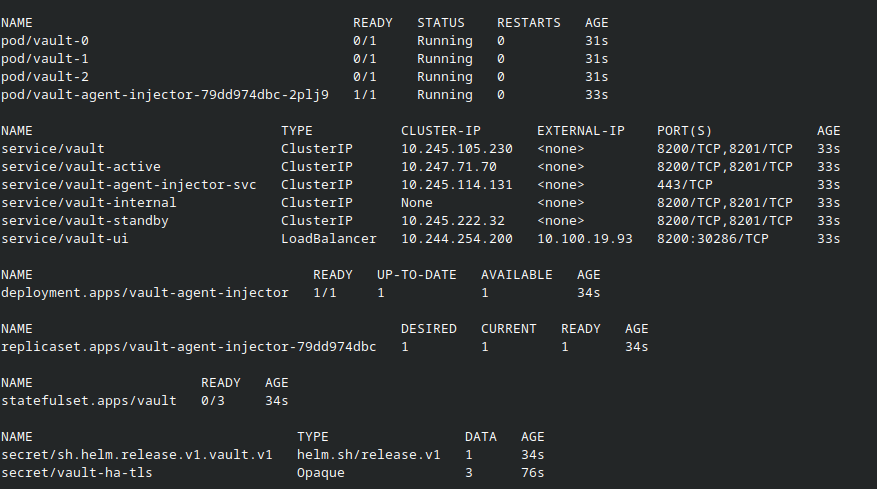 Ketika kita sudah install vault, status pod masih belum ready karna kita harus unseal masing-masing pods.