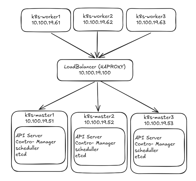 Kita akan melakukan instalasi kubernetes cluster yang dimana kita akan menggunakan high available setup. Kita akan menggunakan LoadBalancer (haproxy) untuk koneksi control-plane endpoint.