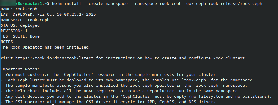 helm install --create-namespace --namespace rook-ceph rook-ceph rook-release/rook-ceph