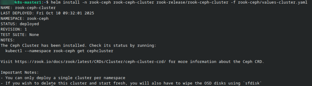 helm install -n rook-ceph rook-ceph-cluster rook-release/rook-ceph-cluster -f rook-ceph/values-cluster.yaml