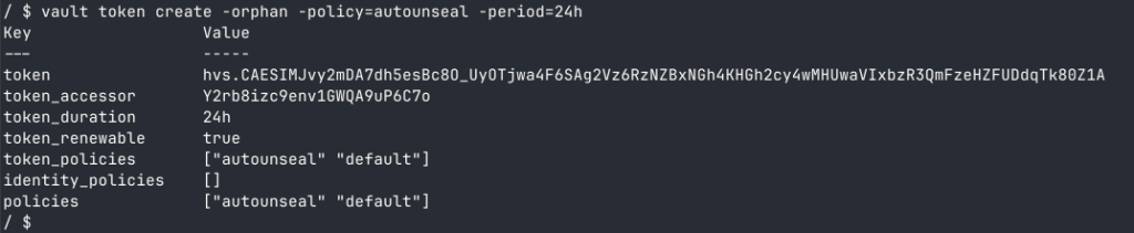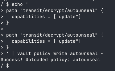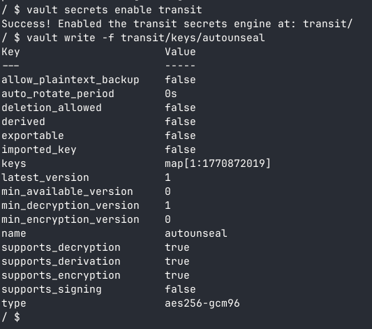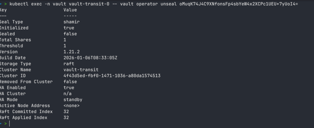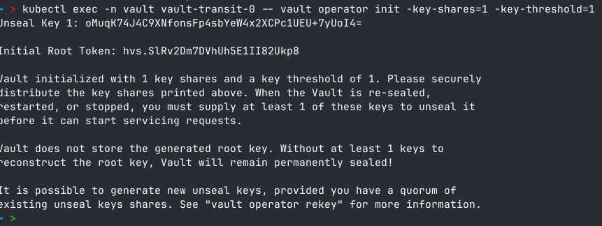 kubectl exec -n vault vault-transit-0 -- vault operator init -key-shares=1 -key-threshold=1