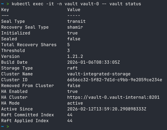 kubectl exec -n vault vault-transit-0 -- vault operator unseal <SEALTOKEN>
