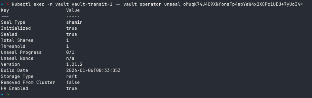 kubectl exec -n vault vault-transit-1 -- vault operator unseal <UNSEALTOKEN>