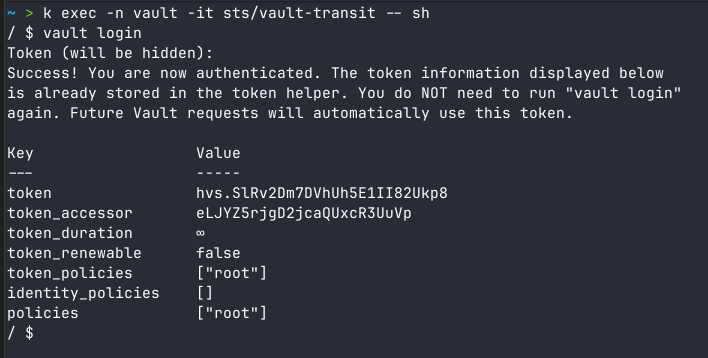 kubectl exec -n vault -it sts/vault-transit -- shKita login menggunakan root token yang sudah diinisiasi