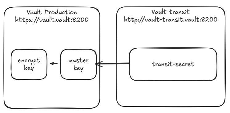Vault transit akan menyimpan key dari production, kemudian vault production akan mengguakan vault-transit ketika ingin unseal